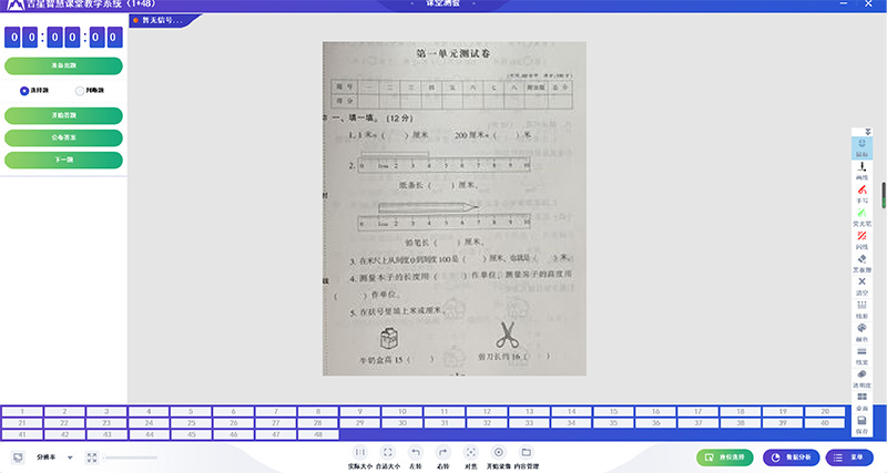 教師通過(guò)大屏展示測(cè)驗(yàn)考題,將試題轉(zhuǎn)化為電子形式展示,節(jié)約成本的同時(shí)也能夠讓學(xué)生清晰地看到試題。學(xué)生通過(guò)按鈕進(jìn)行作答,大屏實(shí)時(shí)展示答題狀況。